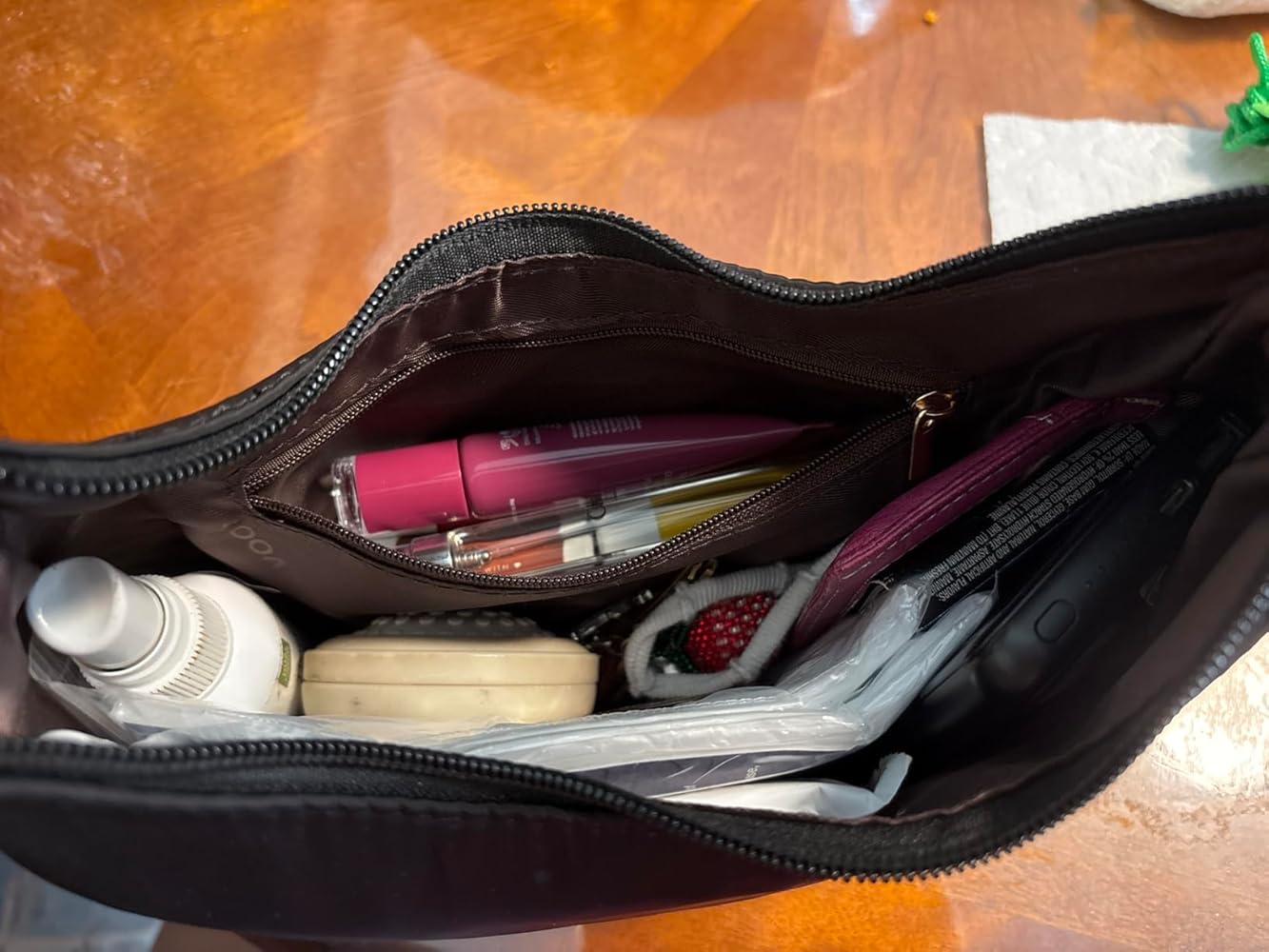 Finished with smooth zippers and polished metal hardware, it combines durability with elegance. Measuring 10.75" × 5.5" × 1.85", the bag offers roomy storage for daily essentials like mini wallets, cosmetics, skincare, keys, sunglasses, and phones of various sizes.